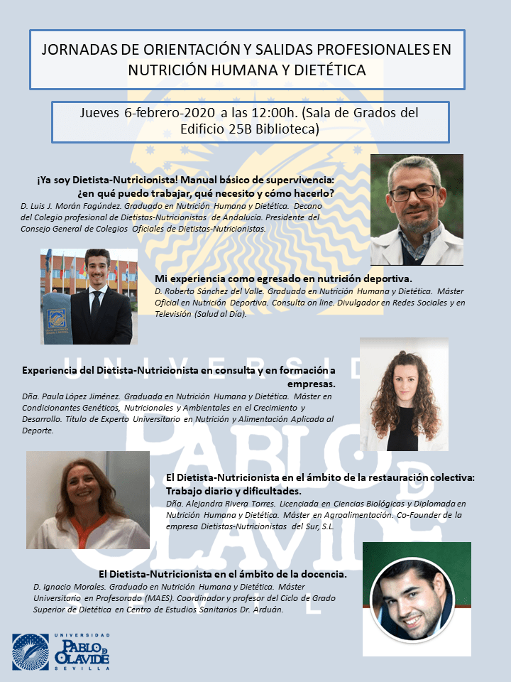 Jueves 6-febrero-2020 a las 12:00h. Sala de Grados del Edificio 25B Biblioteca. Universidad Pablo de Olavide, Sevilla. Ponentes: D. Luis J. Morán Fagúndez. Graduado en Nutrición