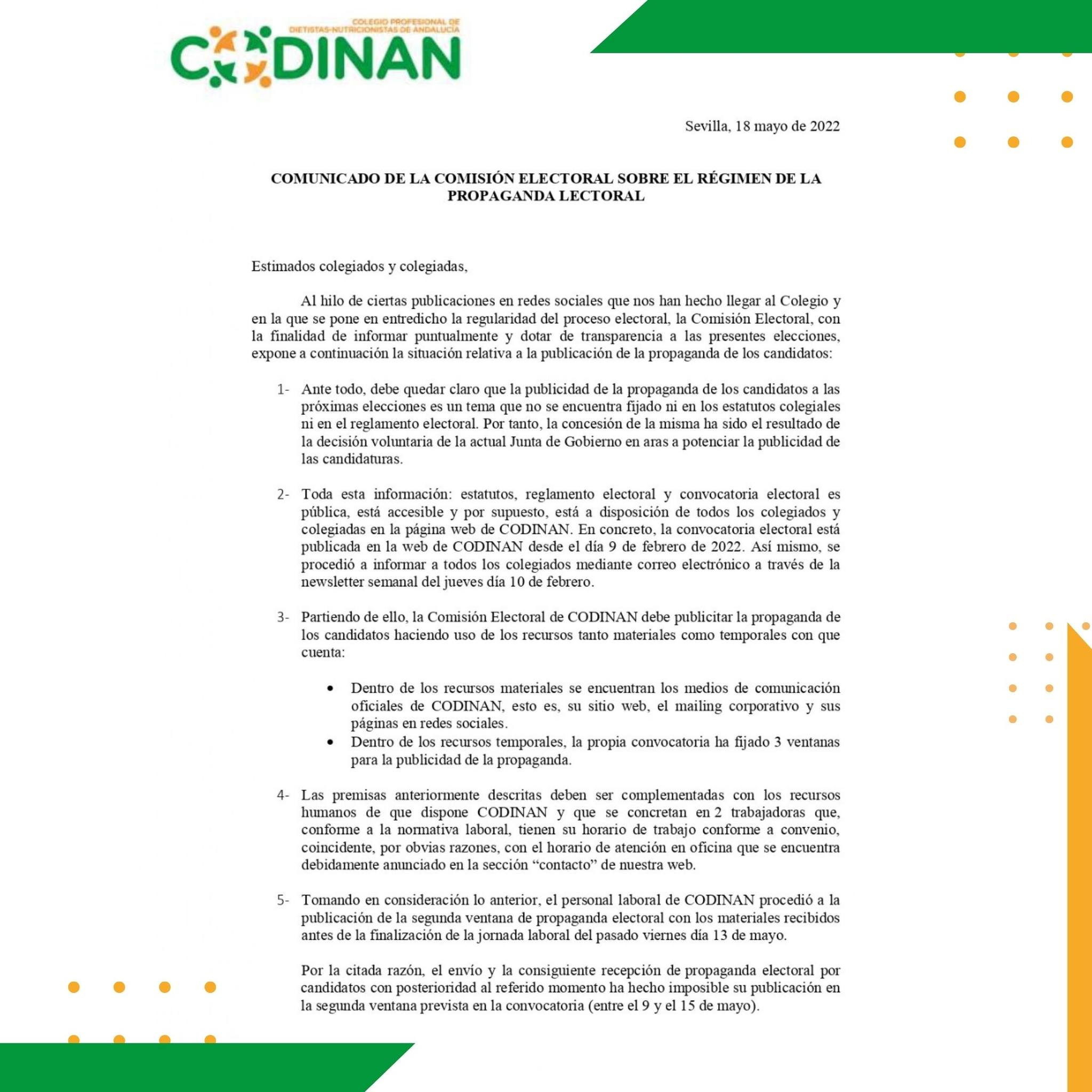A continuación le hacemos llegar comunicación de la Comisión Electoral sobre el régimen de la propaganda electoral de la próximas elecciones de Codinan que se
