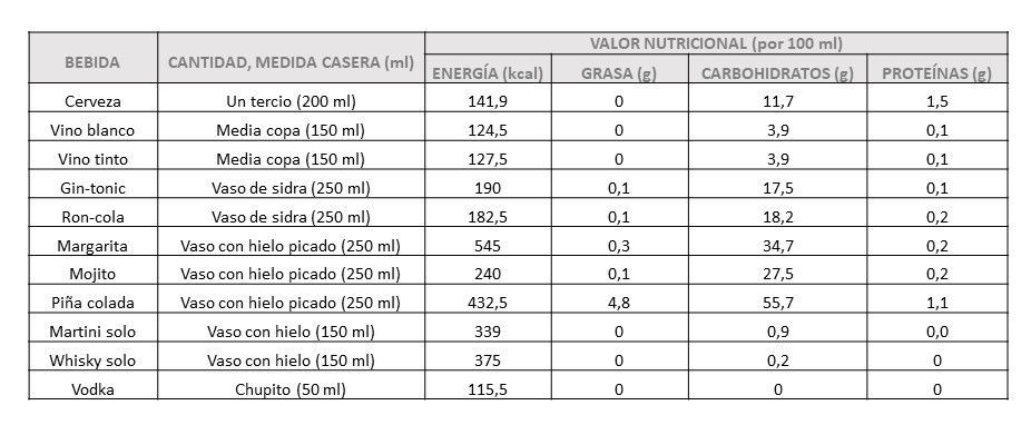 Tabla 1: Valor nutricional aproximados de bebidas alcohólicas comúnmente consumidas.