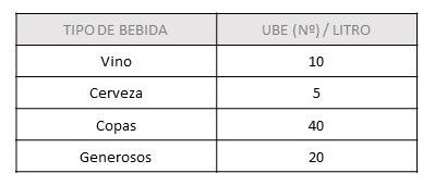 En cuanto al grado de alcohol en las diferentes bebidas, se emplea el término Unidad de Bebida Estándar (UBE). En España, una UBE se corresponde con 10 gramos de etanol puro (12).