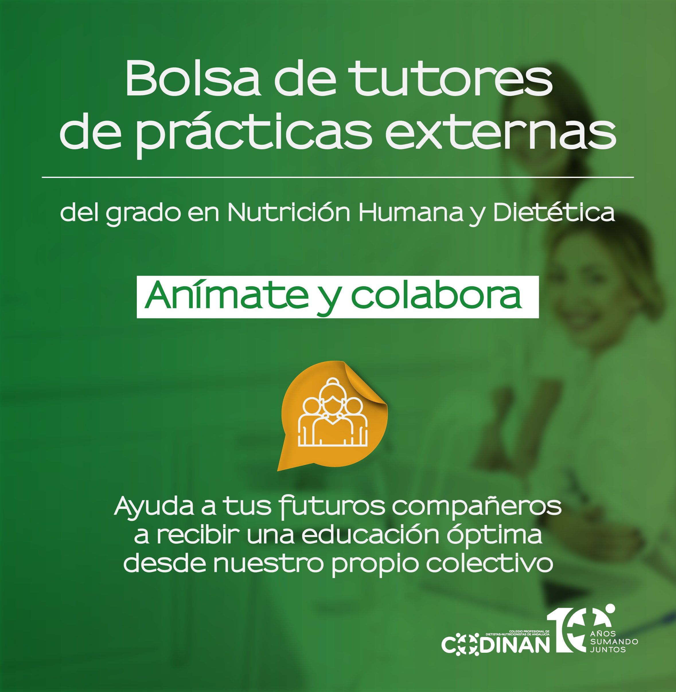 Conocedores de la dificultad existente para encontrar un destino adecuado a los estudiantes del grado en Nutrición Humana y Dietética , desde CODINAN ponemos en marcha esta bolsa de tutores externos para facilitar que los/as alumnos/as realicen las prácticas curriculares con dietistas-nutricionistas.