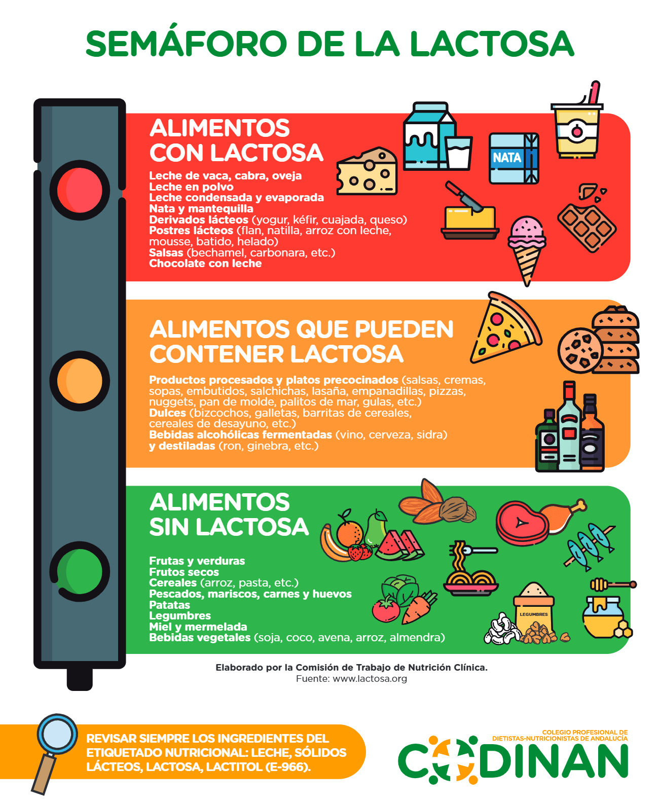 –El SEMÁFORO DE LA LACTOSA: Aparecen ordenados con los colores del semáforo los alimentos que contienen lactosa, los que pueden contenerla y los que están libres de la misma.