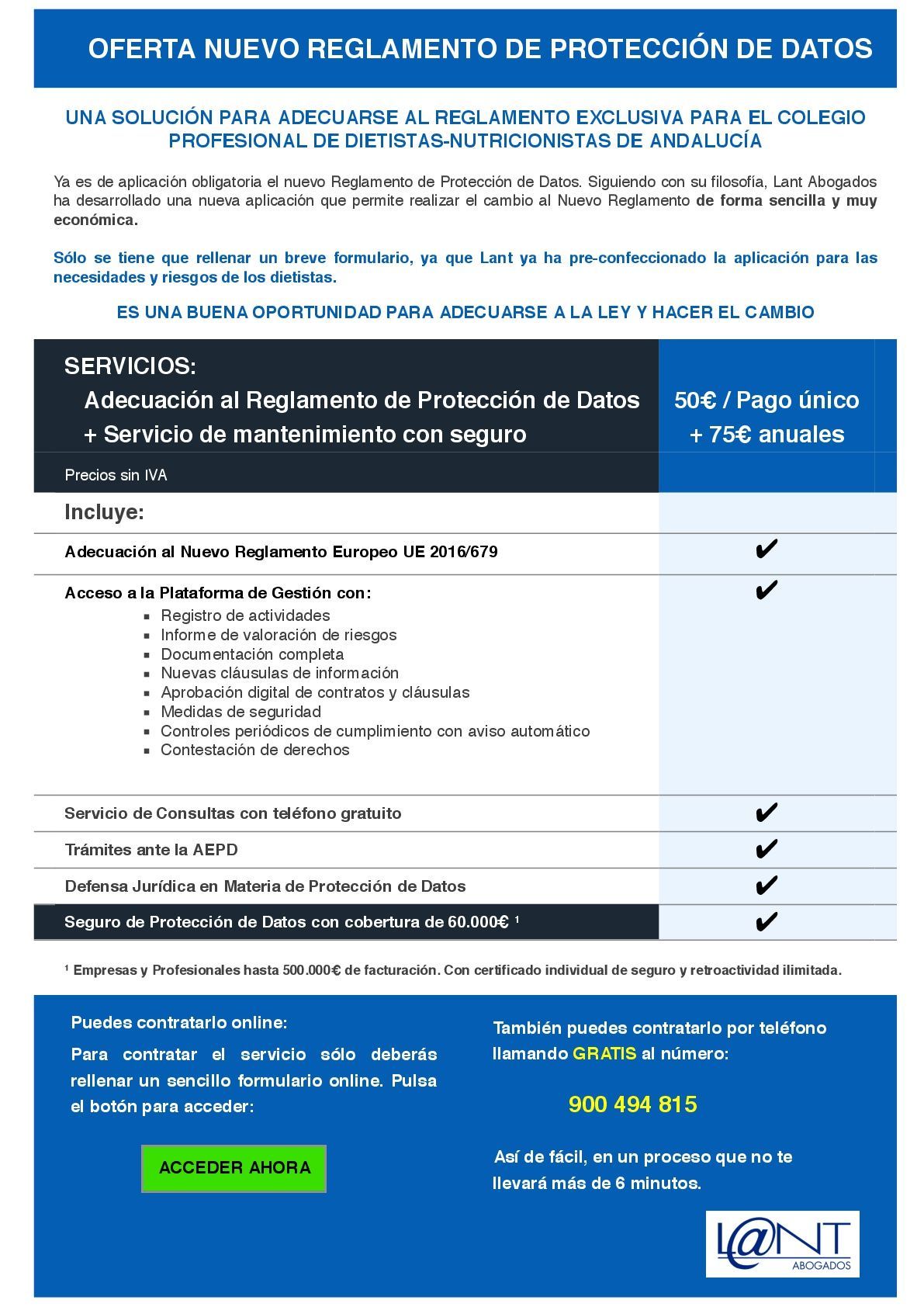 CODINAN mantiene un acuerdo de colaboración con L@NT Abogados para ofrecer a los colegiados los servicios de adecuación al nuevo Reglamento de Protección de Datos a precios reducidos: