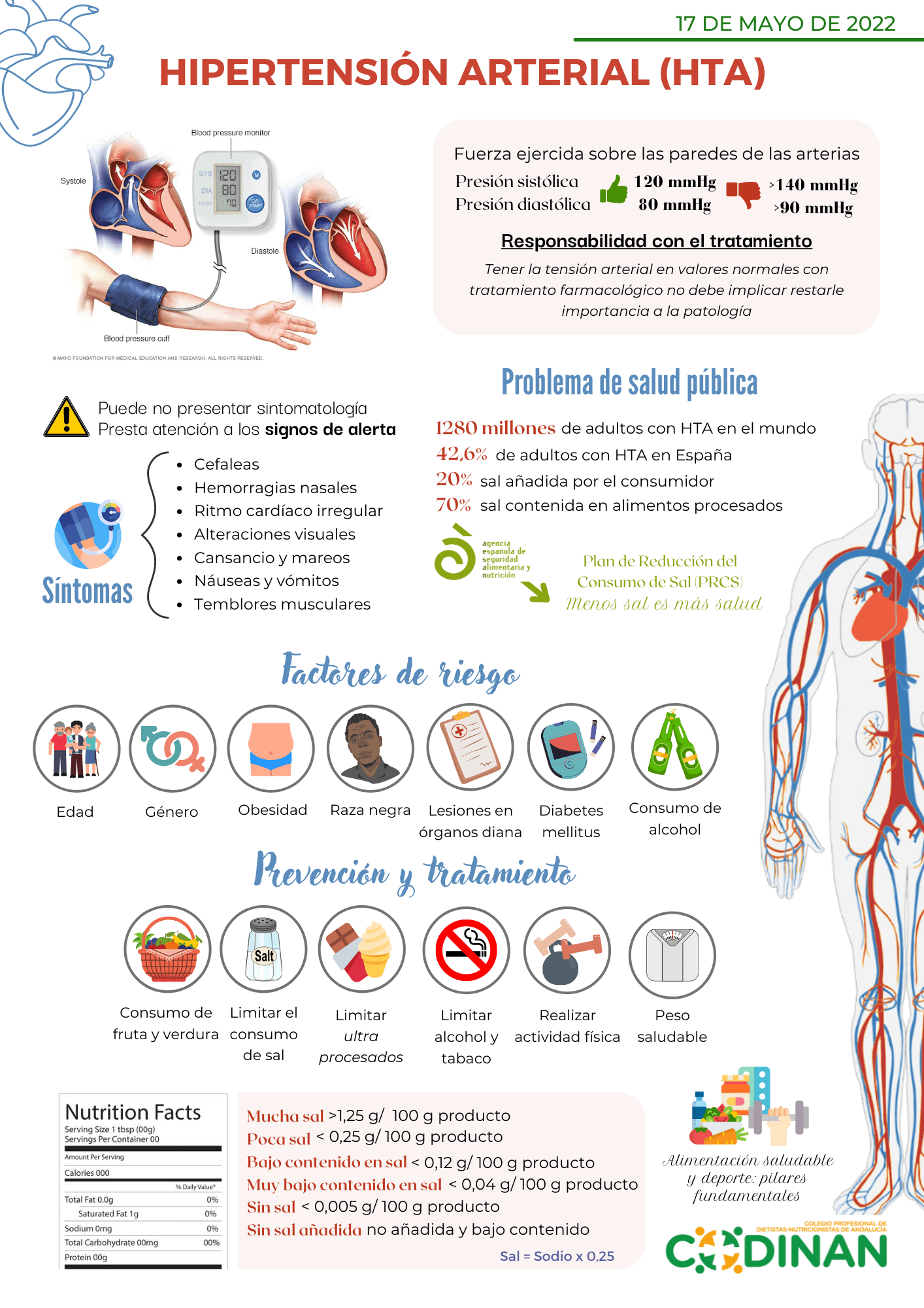 Hoy, día 17 de mayo, se celebra el Día Mundial de la Hipertensión Arterial (HTA). En España, la prevalencia de esta patología es abundante y requiere de concienciación en materia de prevención y de hábitos saludables. En muchos casos, se pauta tratamiento farmacológico, pero es importante destacar la necesidad de acompañar el consumo de medicamentos con alimentación saludable y actividad física. Es preciso, por tanto, tener responsabilidad con el consumo de fármacos y llevar a cabo un adecuado abordaje nutricional.
