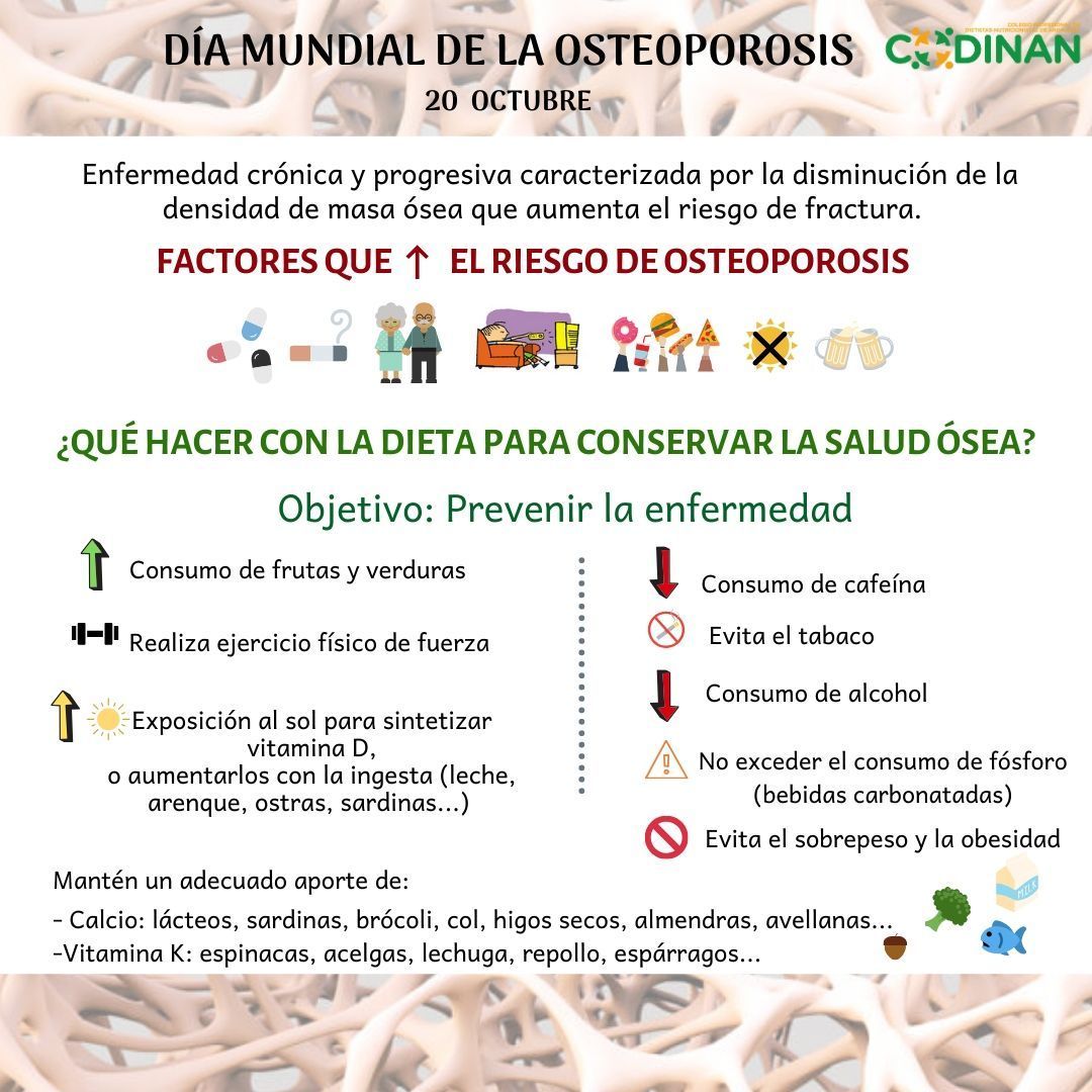 En el día mundial de la osteoporosis, CODINAN quiere resaltar la importancia de la prevención en esta enfermedad y muestra con esta infografía qué factores podemos evitar y cuáles promover para mejorar nuestra salud ósea: