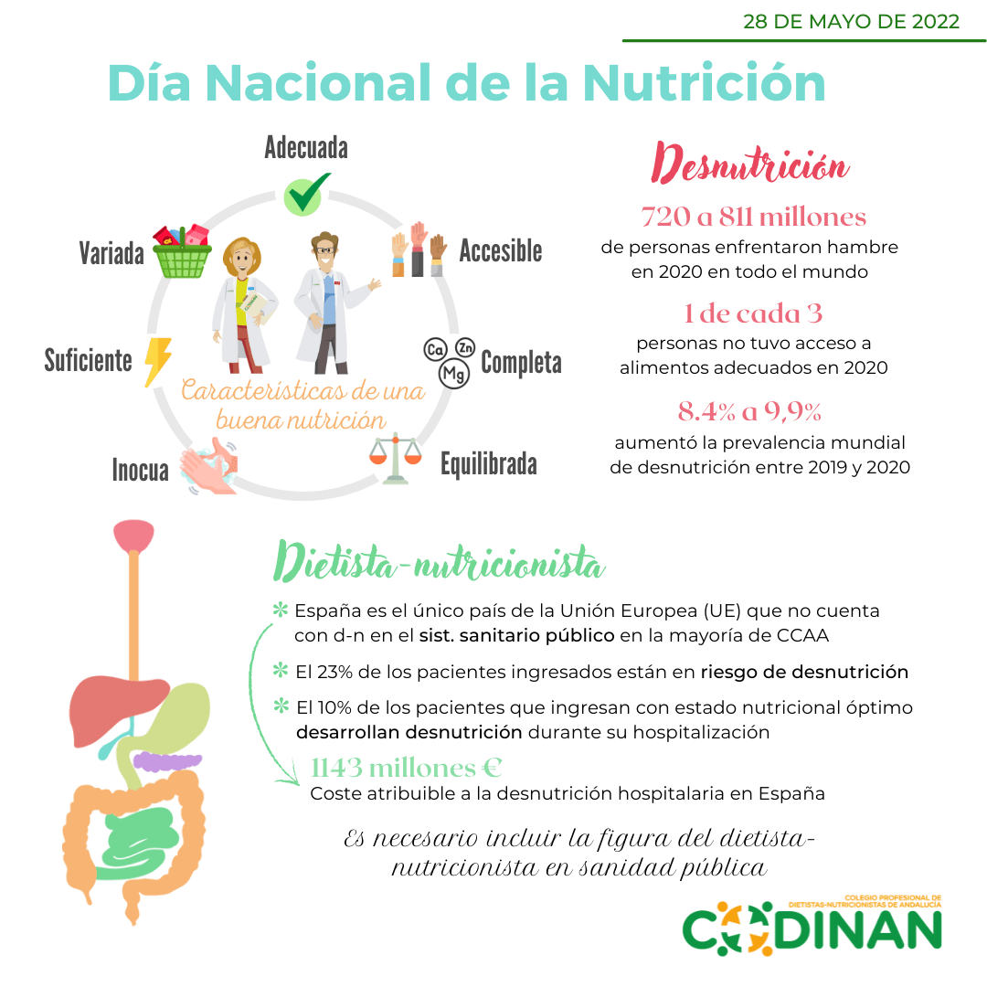 La Federación Española de Sociedades de Nutrición, Alimentación y Dietética (FESNAD) estableció el 28 de mayo como el día Nacional de la Nutrición, apoyado cada año por la Agencia Española de Seguridad Alimentaria y Nutrición (AESAN). Desde el Colegio Profesional de Dietistas-Nutricionistas de Andalucía (CODINAN) nos sumamos a este día con el que tanto nos identificamos, aprovechando el mismo para reclamar el derecho a la alimentación.
