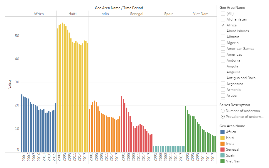 En España, somos muy afortunados de tener alimentos para nutrirnos cada día. Como se puede ver en el gráfico anterior, la prevalencia de desnutrición en nuestro país es bastante baja (menos del 2,5% en el año 2019) en comparación con otros países como Haití, donde la cifra de desnutrición casi supera el 50% de la población. Aproximadamente, una de cada cinco personas (21 por ciento de la población) se enfrentaba al hambre en África en 2020, más del doble de la proporción de cualquier otra región.