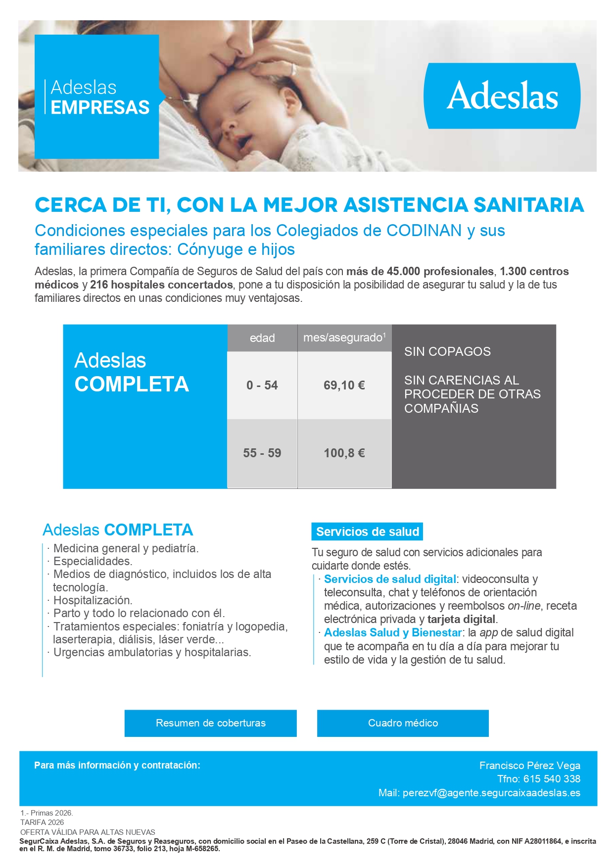Con motivo del acuerdo de colaboración que CODINAN mantiene con la compañía líder Adeslas, a continuación se muestra información actualizada de la oferta para la contratación del seguro de salud para el año 2026.