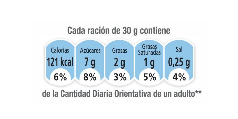 En este caso, consumiendo una ración de 30 g de producto, se cubre el 6% de las kcal estimadas que un adulto sano necesita (2000 kcal). En cuanto a los nutrientes, y tomando como referencia el mismo tamaño de ración, se cubre el 8% de las necesidades de azúcares, el 3% de grasa (5% de grasas saturadas) y el 4% del total de sal considerado adecuado.