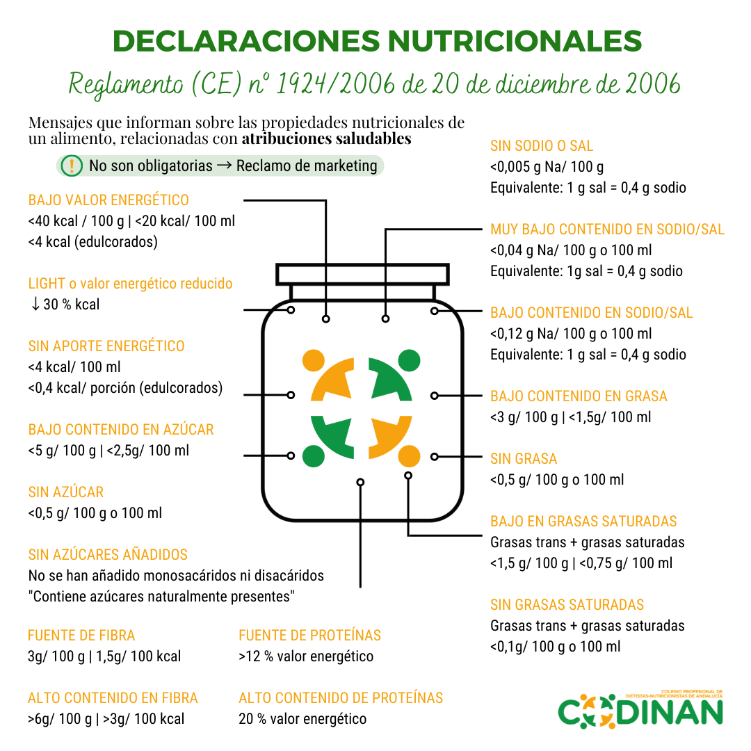 Además del Real Decreto mencionado al principio del presente documento, hay otro tipo de documentos donde quedan regulados otros aspectos relacionados con el etiquetado nutricional. Es el caso del Reglamento (CE) nº 1924/2006 del Parlamento Europeo y del Consejo, de 20 de diciembre de 2006, relativo a las declaraciones nutricionales y de propiedades saludables en los alimentos. En este reglamento, así como en otros documentos legales de niveles tanto europeos como nacionales (enlace, enlace, enlace, enlace, enlace), se regulan las declaraciones nutricionales y condiciones de uso.