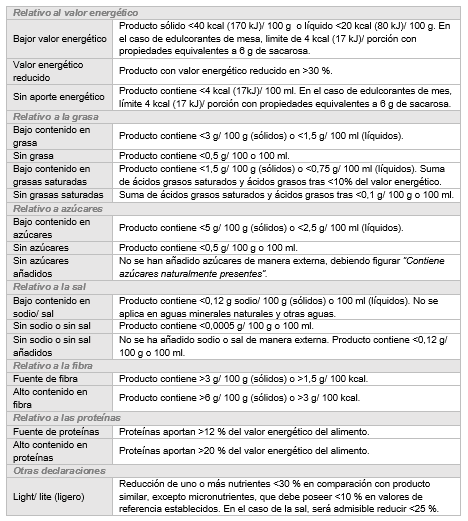 Respecto a los nutrientes, debe aparecer de manera obligatoria la cantidad equivalente a 100 gramos o ración del alimento de cantidad de grasas, ácidos grasos saturados, hidratos de carbono, azúcares, proteínas y sal. De manera complementaria, puede aparecer información relativa a: ácidos grasos monoinsaturados y poliinsaturados, polialcoholes, almidón, fibra alimentaria, cualquier vitamina o mineral. Asimismo, este valor puede expresarse como porcentaje de las ingestas de referencia expuestas, incluyendo la declaración adicional «Ingesta de referencia de un adulto medio (8400 kJ/ 2000 kcal)».