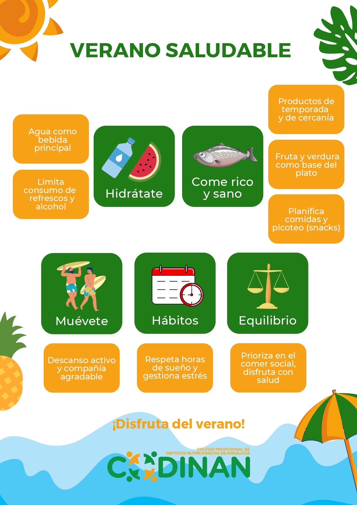 Desde Codinan, queremos haceros llegar unos consejos de verano. El objetivo es transmitir el mensaje de priorizar comer rico y sano durante la temporada. Es posible mantener unos hábitos alimentarios saludables, aunque cambien dependiendo del contexto y seamos algo más flexibles en vacaciones.