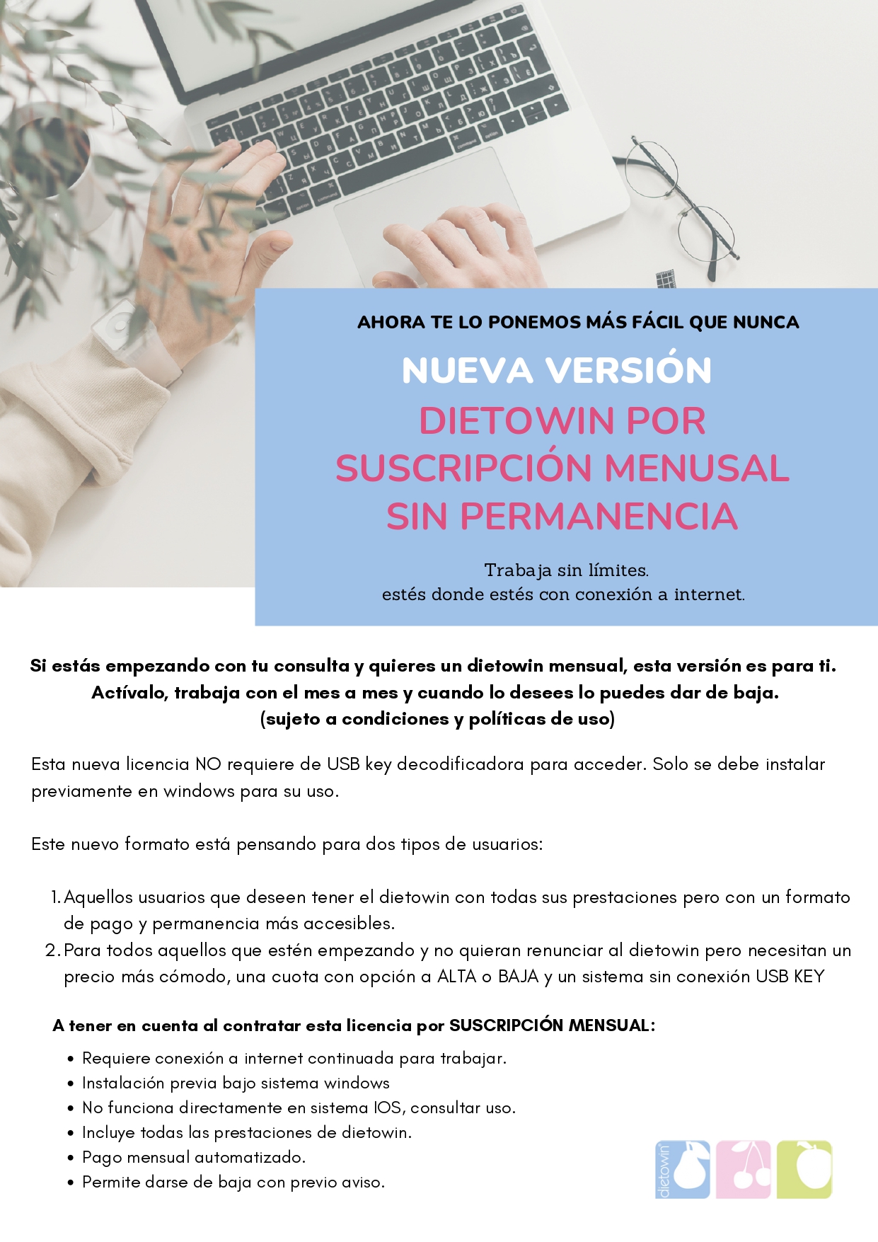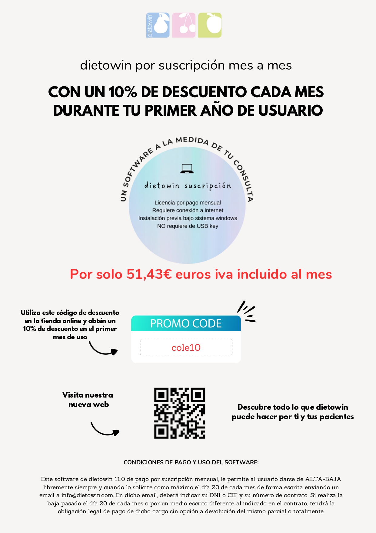 Como novedad, se ha lanzado un DIETOWIN 11.0 DE PAGO POR SUSCRIPCIÓN MENSUAL con una cuota muy cómoda, de pago mes a mes y con opción de darse de baja cuando deseen sin necesidad de un mínimo de permanencia (cumpliendo las condiciones para la baja). Utilizando el cupón descuento, los colegiados de CODINAN podrán beneficiarse de un 10% de descuento cada mes durante el primer año de usuario.