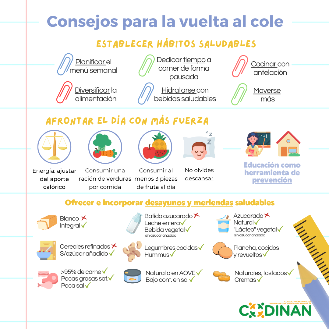 Desde CODINAN, hacemos llegar estas recomendaciones para una vuelta al cole saludable, con el fin de orientar a las familias en el establecimiento de pautas alimentarias adecuadas que puedan contribuir al bienestar de los menores y los adultos.